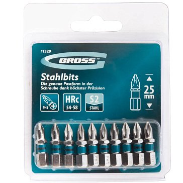 - Набор бит Gross 11344 состоит из 10 насадок типоразмера PZ1 и длиной 50 мм, с хвостовиком 1/4 дюйма, изготовленных из стали S2 и предназначенных для шуруповертов. Оснастки служат для монтажа и демонтажа шурупов, саморезов и других резьбовых соединений. Шлиц PZ имеет 4 дополнительных ребра, благодаря чему предотвращается проскальзывание биты в крепеже, повышаются точность и эффективность работ.